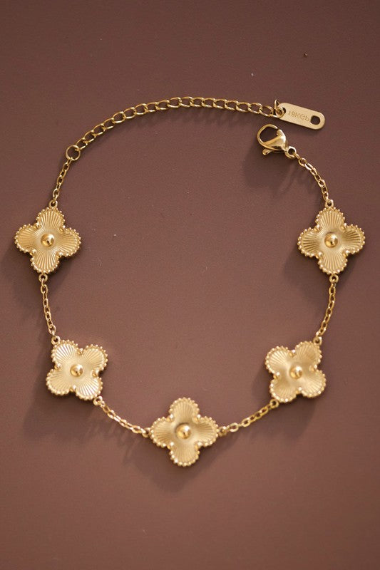 Elevate your style with our 18K gold plated stainless steel clover chain bracelet. This exquisite 7" bracelet features a 2" extender for perfect fit. Crafted for lasting beauty, it's hypoallergenic, waterproof, fade-resistant, and tarnish-free, ensuring you'll enjoy its luxurious shine for years. Versatile enough for daily wear yet elegant for special moments, this dainty clover design adds a touch of sophistication to any outfit. Indulge in affordable luxury that keeps its promise of enduring beauty.